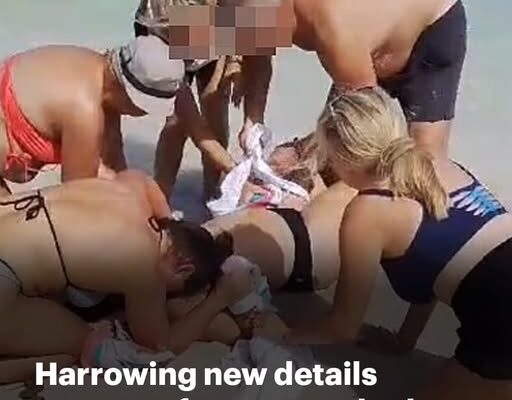Shocking pictures show people who appear to be the woman’s family helping to stem the blood flow as she lies injured on the beach