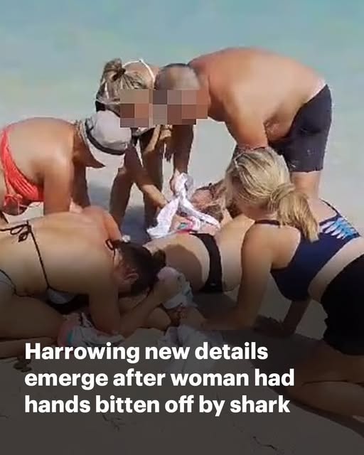 Harrowing pictures show how a crowd then gathered around the injured woman after she made it back to the beach, with cloths being held onto her arms as they apparently tried to stem the bleeding.