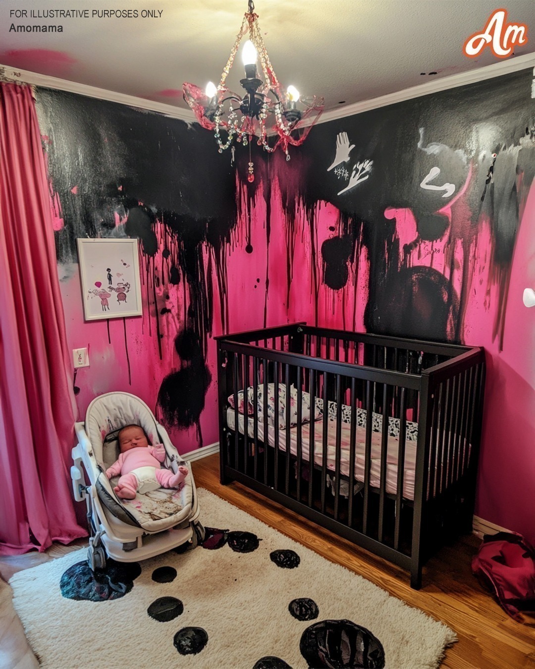 Gone were the soft pink walls, replaced by pitch, oppressive black paint. The floral curtains had vanished. Heavy dark drapes blocked out the sunlight instead. And the crib… the crib Tim and I had spent hours putting together? It lay in pieces on the floor.